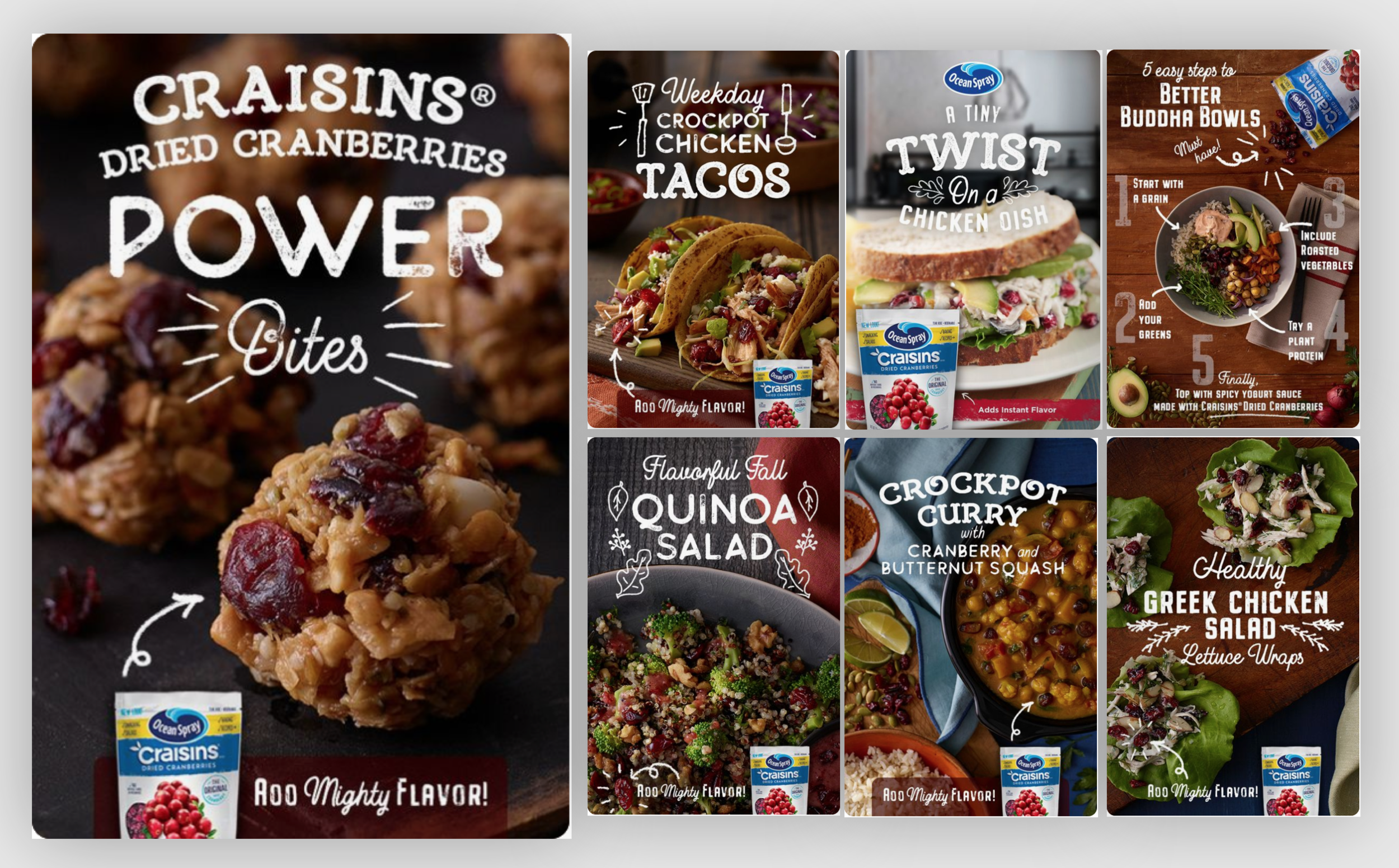 Ocean Spray asked me to step in and help out with a super-cool Pinterest campaign to promote awareness of their Craisins Dried Cranberries products via easy, nutritious, and delicious recipes. I worked with a designer, a food stylist, a photographer, a producer, and the Ocean Spray team to come up with a clever naming convention and fun voice for these creative dishes.