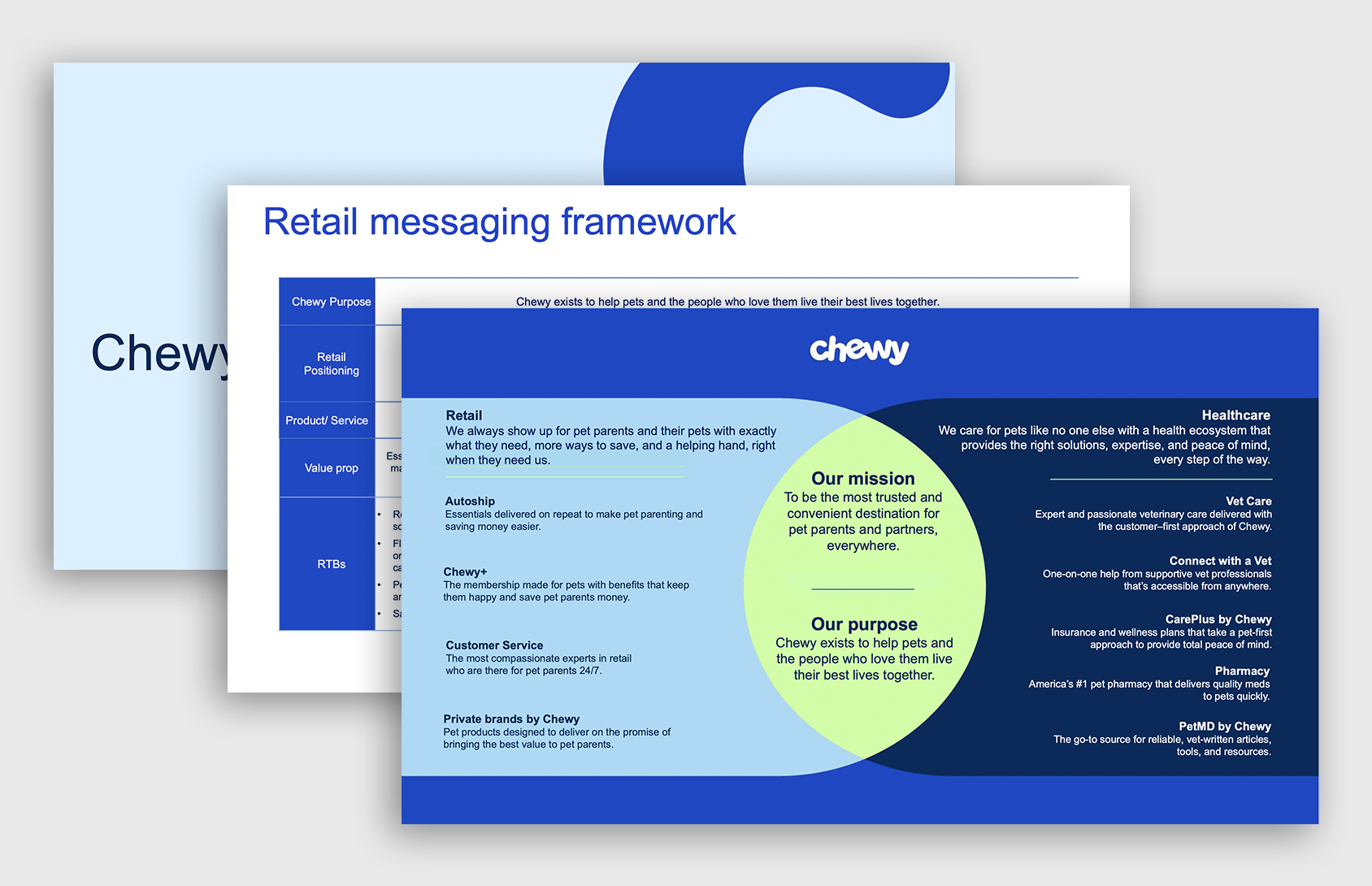 Working directly with the brand team and Chief Brand Officer I developed and rewrote the entire Chewy brand platform including the purpose statement and value props for all of the Chewy offerings. The result was a clear vision for the company that will help steer all Chewy operations.